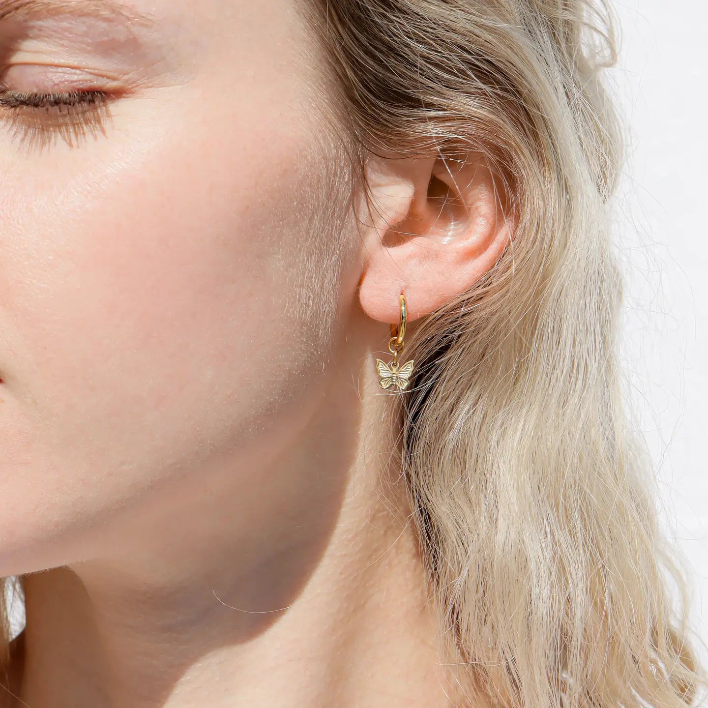 Cecilia Taylor 18K Gold Pvd Stainless Steel Butterfly Huggie Earrings. Beautiful and fun as well as waterproof, sweatproof, anti-tarnish, and hypoallergenic