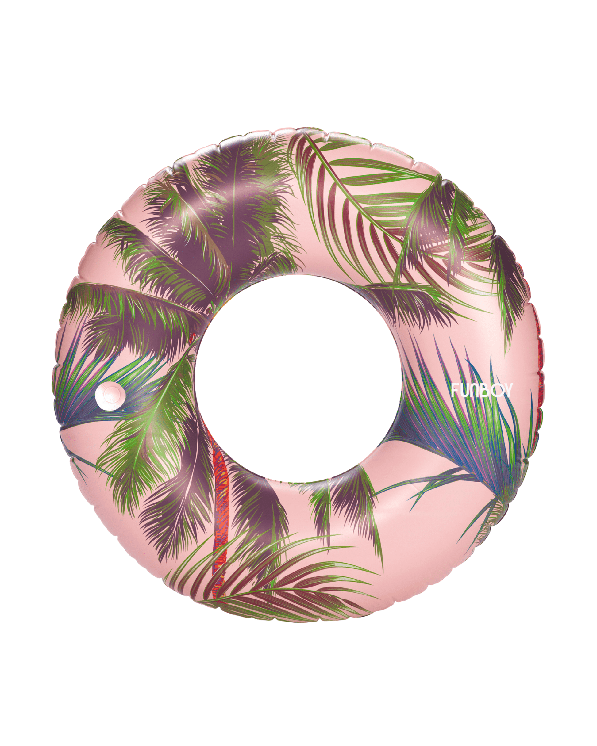 Welcome to California-cool. This tube pool float is an ode to vintage-cali summer vibes, with tropical palms and luscious greens & pinks. Oversized tube (donut) float. 50’’ diameter. Inflates in minutes!